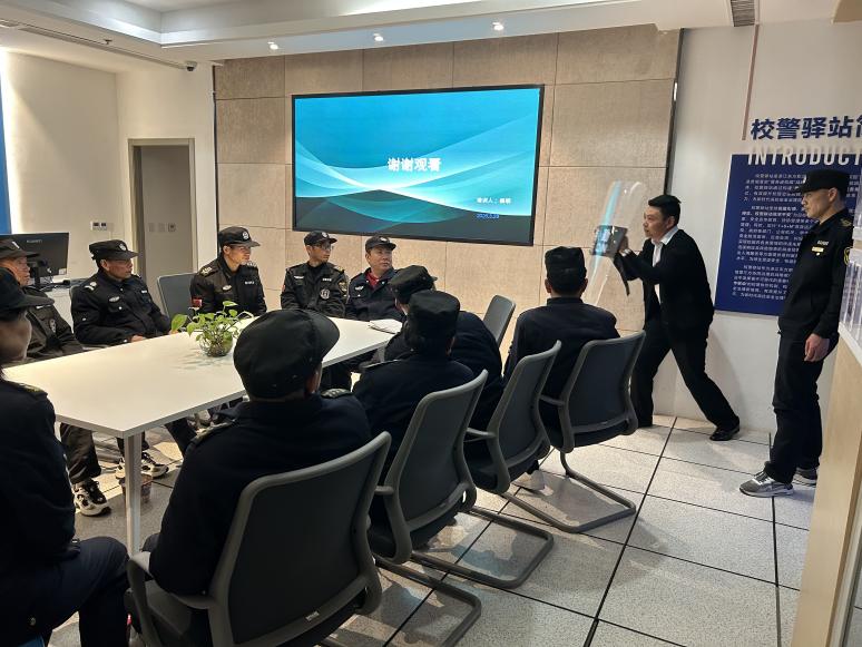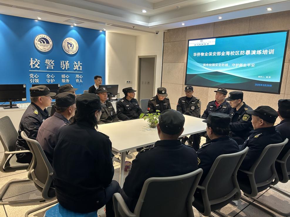 为进一步提升校园安保队伍应对突发暴力事件的处置能力,切实保障全校师生人身财产安全,2026年3月29日,学校保卫部联合华侨物业金海校区安保团队,在校警驿站开展防暴专项演练培训。本次培训由华侨物业安保部杨明主讲,全体安保人员参与培训。